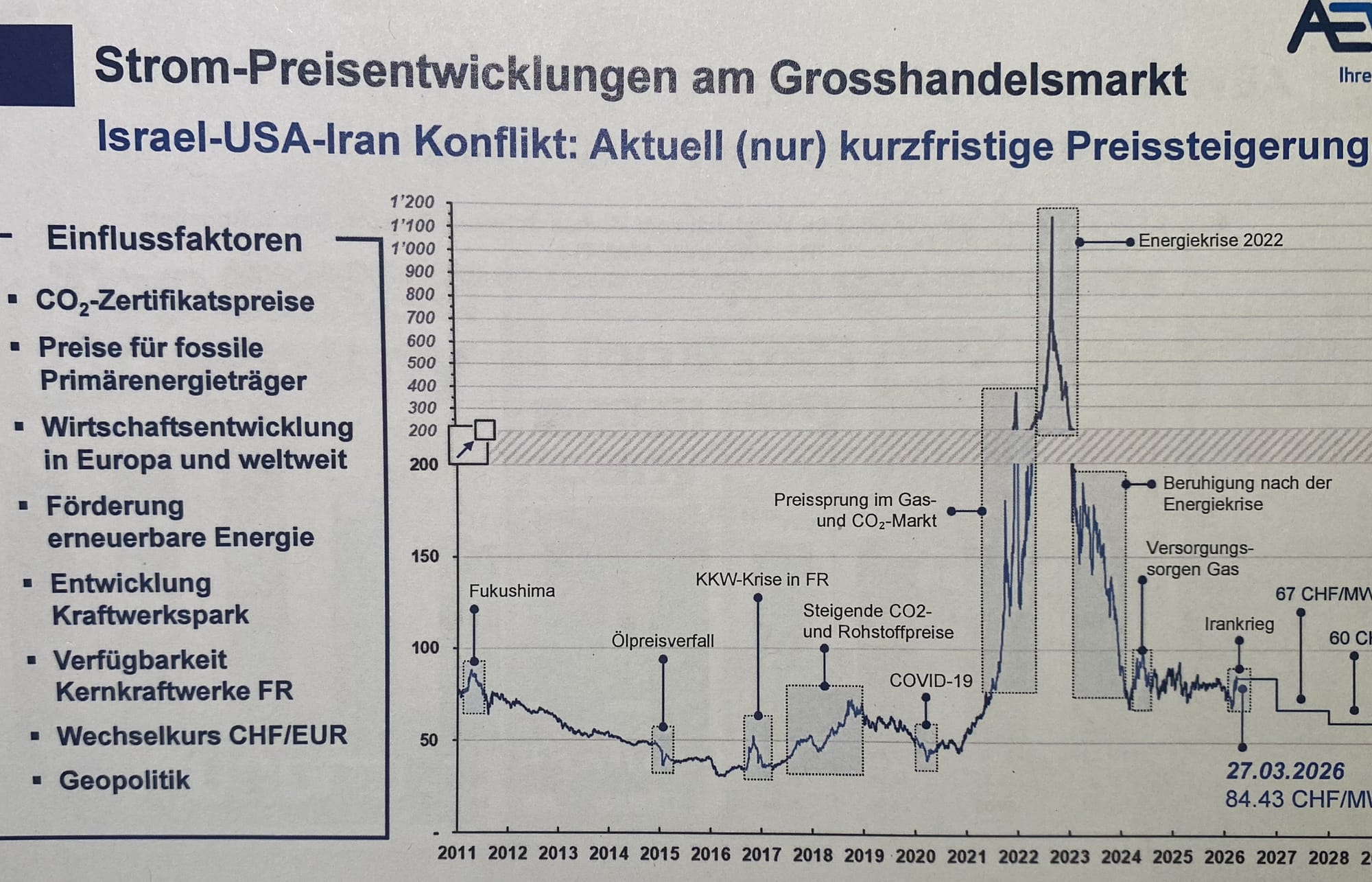 Anhand einer Grafik zeigte CEO Marc Ritter auf, dass sich der Strompreis am Markt - im Gegensatz zum Ausbruch der Ukrainekriegs 2022 - bisher vom jüngsten Irankrig nicht stark hat beeindrucken lassen - im Gegensatz zu Öl- und Gaspreis. Es gab zwar kurzzeitig einen kleinen Strompreispeak, doch die Preissituation sei recht stabil. Falls der Irankrieg bald endet, rechnet Ritter für die Konsumentinnen und Konsumenten nicht mit starken Preisausschlägen beim Strom.