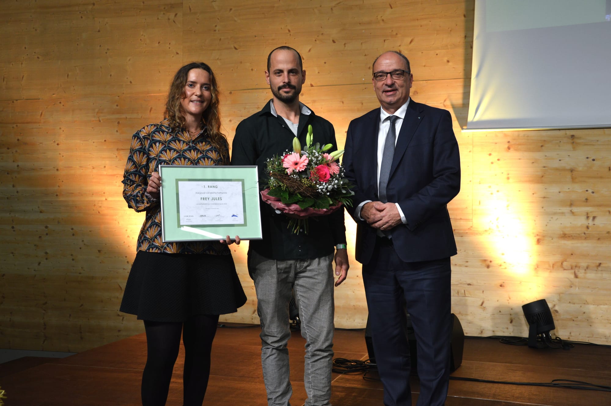 Den Hauptpreis holte sich Jules Frey aus Muri. Mit grosser Freude nahm er den Preis von Landwirtschaftsdirektor Markus Dieth auf der Bühne der Vianco Arena in Empfang. Der 34-jährige Meisterlandwirt führt den traditionsreichen Klosterhof in Muri mit frischem Elan und klarer Vision. Er verbindet traditionelle Landwirtschaft mit innovativen Ideen. Jules Frey hat bei mehreren wichtigen Kriterien gepunktet. Er bewirtschaftet laut Mitteilung einen äusserst vielseitigen Betrieb, hat eine ausgezeichnete Nase für den Markt und setzt mutig neue Ideen um.