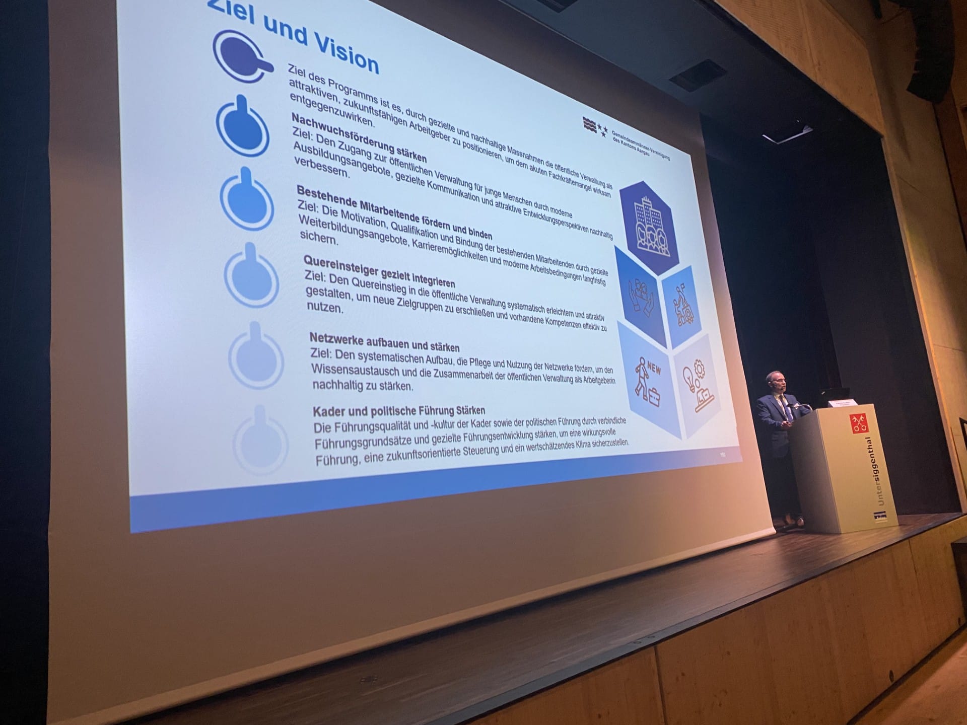 Ziel des Programms ist es, durch gezielte und nachhaltige Massnahmen die öffentliche Verwaltung als attraktive, zukunftsfähige Arbeitgeberin zu positionieren, um dem Fachkräftemangel entgegenzuwirken. Es wurden folgende übergeordnete Ziele definiert, die Patrick Gosteli vor den rund 400 Teilnehmenden auflistete.