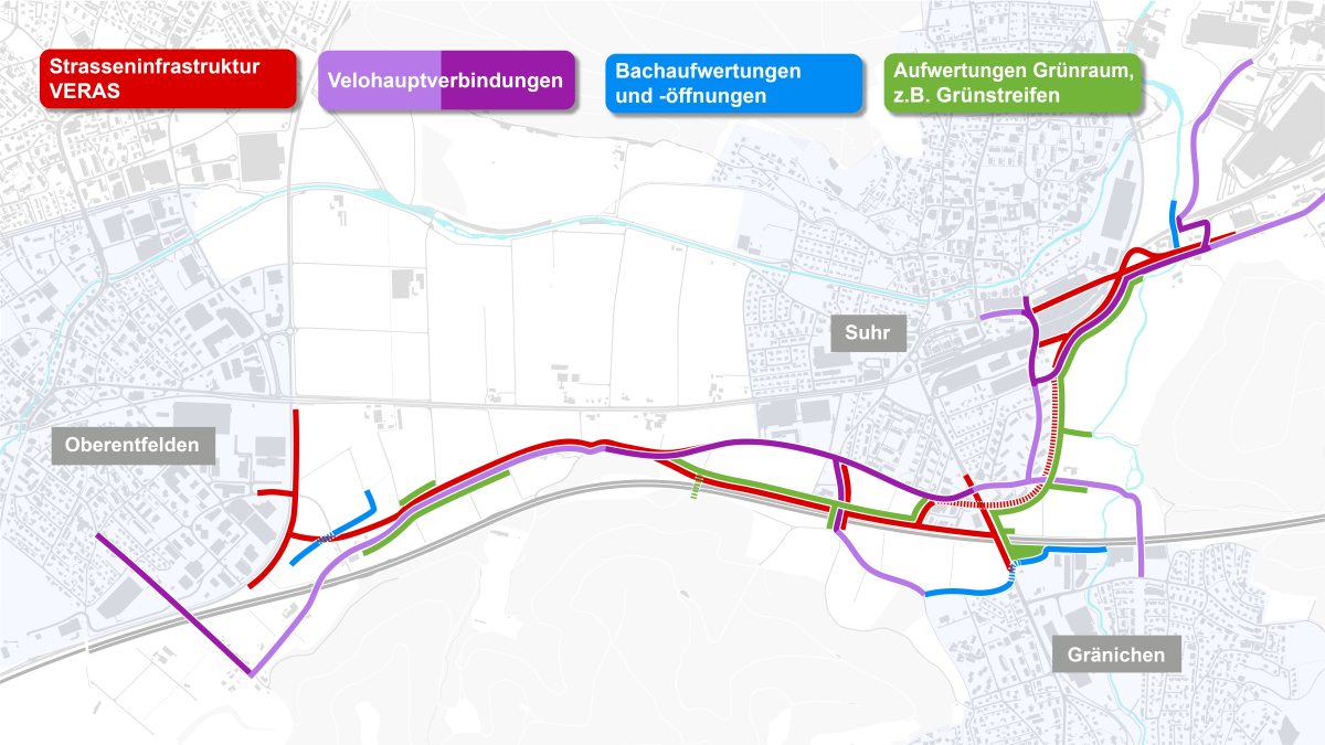 Mit der Gesamtplanung VERAS soll die Verkehrssituation in der Region Suhr verbessert und die Belastung für die Bevölkerung verringert werden. Weniger Durchgangsverkehr und die gezielte Verlagerung des Verkehrs führen zu einer Reduktion von Lärm- und Schadstoffemissionen, heisst es weiter. Dabei werden die Eingriffe in den Landschafts- und den Siedlungsraum wie auch der Bedarf an Kulturland bestmöglich minimiert. Durch die notwendigen Begleitmassnahmen werden zudem die Biodiversität sowie die Freizeit- und Aufenthaltsqualität erhöht.