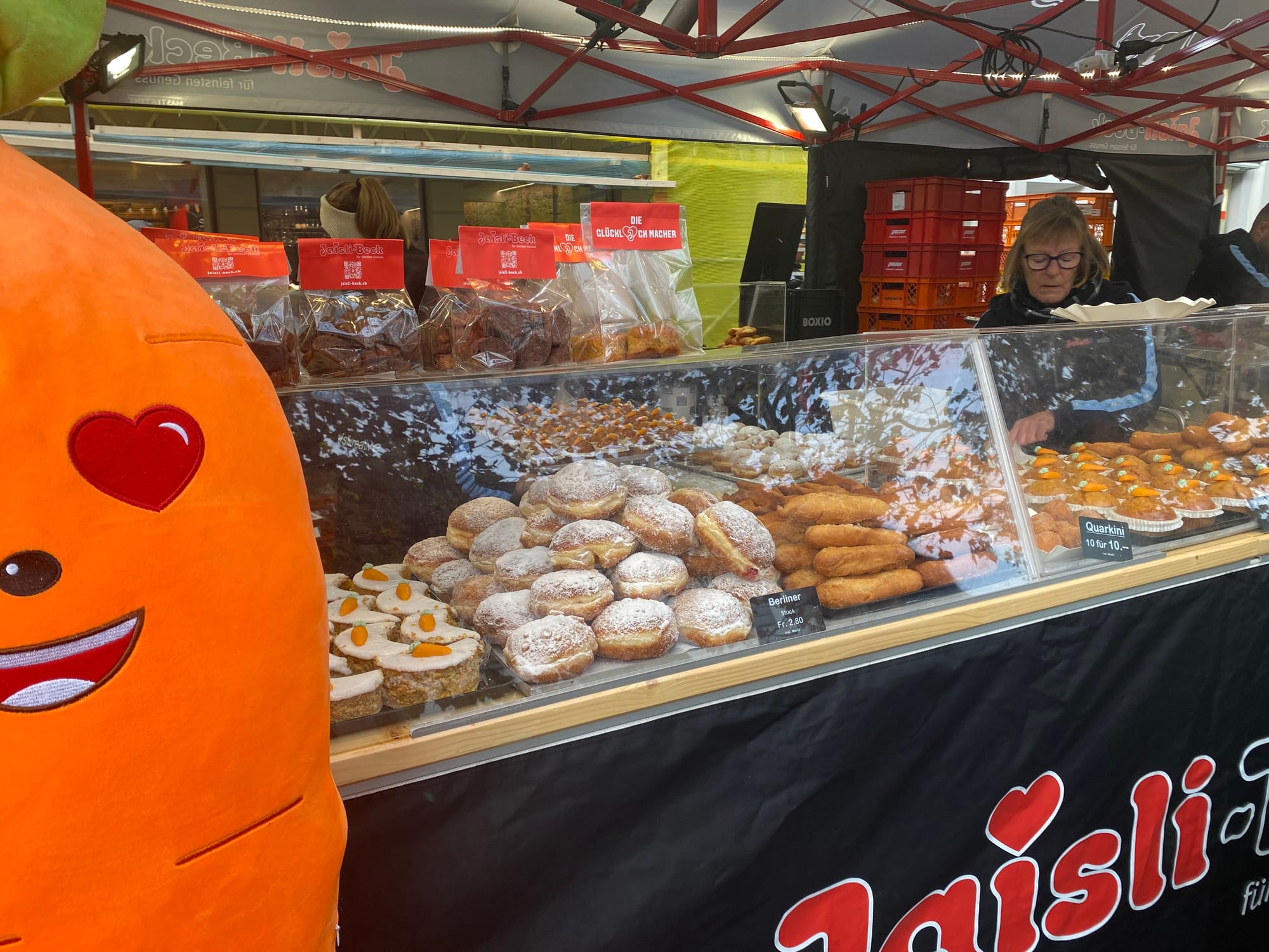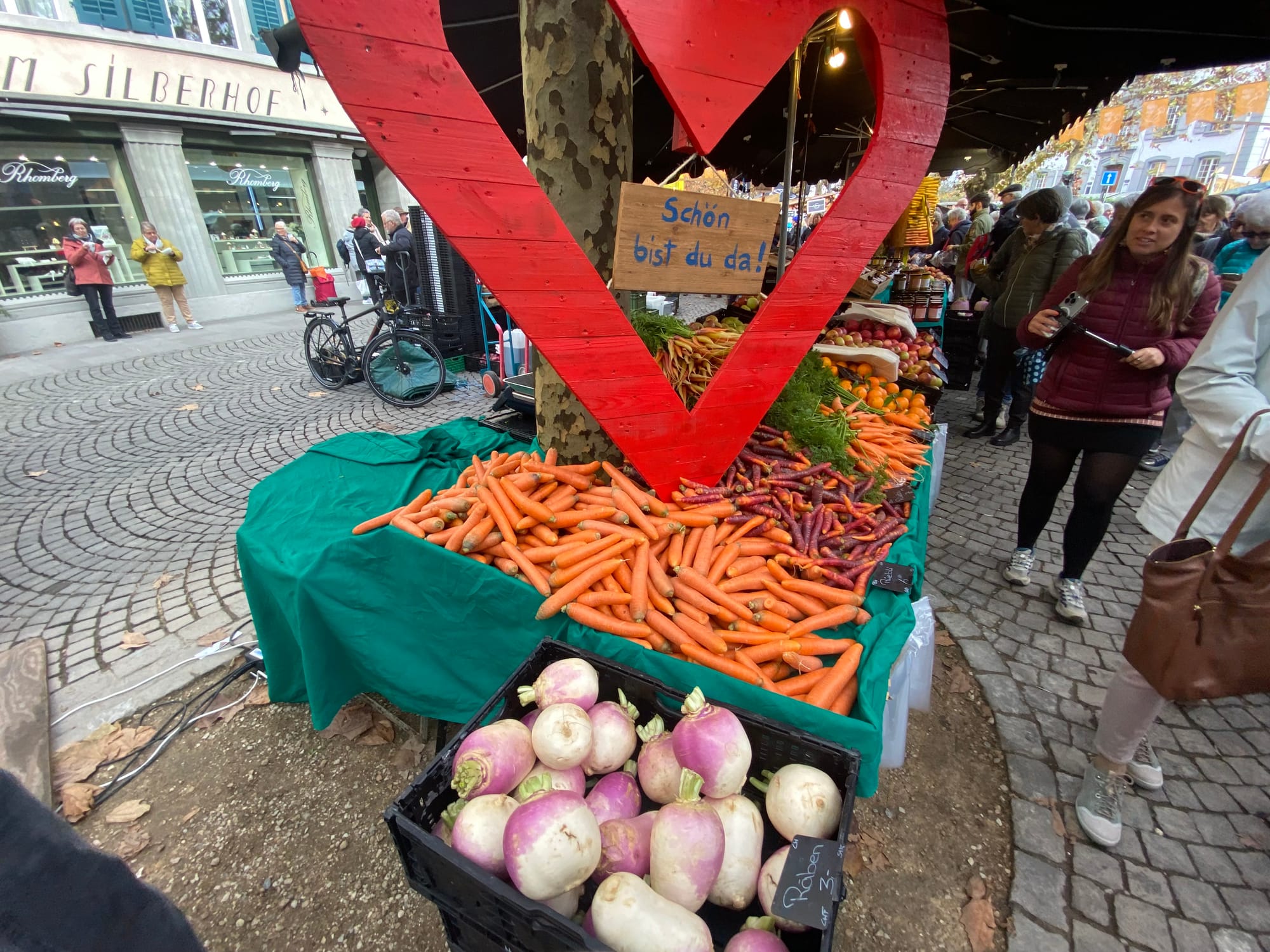 Zum November gehört der traditionelle Rüeblimärt in Aarau. Anfangs noch Nebel, brach vor dem Mittag die Sonne durch, was die Temperatur schlagartig angenehm erhöhte. Zahllose Besucherinnen und Besucher, auch von weither, besichtigten die 140 Marktstände.