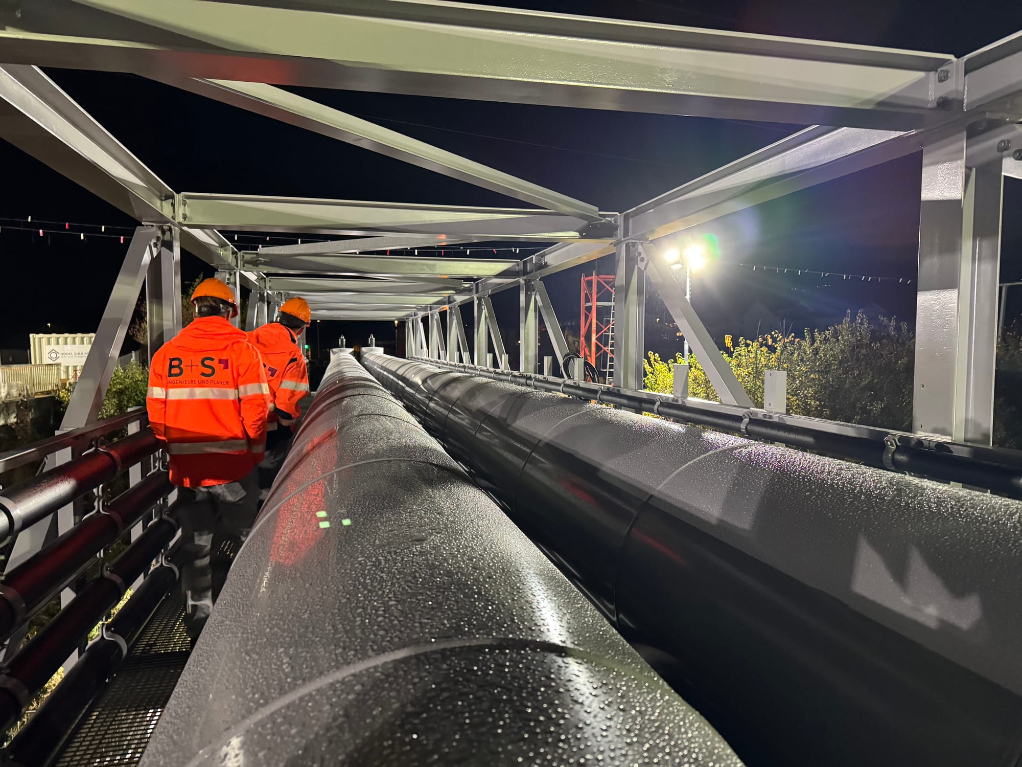 Die Montage erfolgte in vorgefertigten Segmenten, um die Sperrdauer der Autobahn zu minimieren. Auf der Brücke verlaufen zwei Fernwärmerohre sowie zwei zusätzliche Kabelverbindungen. «Ich bin begeistert, wie die WWZ, B+S, Hodel SHLK und die weiteren Partner dieses Projekt partnerschaftlich und mit grösster Präzision umgesetzt haben. Eine solche Verlegung unserer Rohre mit einer eigenen Brücke ist definitiv nicht alltäglich. Umso mehr freut es mich, dass die Installation erfolgreich verlief und unsere vorisolierten Rohrsysteme nun den Ausbau des Wärmeverbunds Ennetsee sowie die Dekarbonisierung unterstützen», hält Martin Rigaud, CEO BRUGG Pipes, fest.